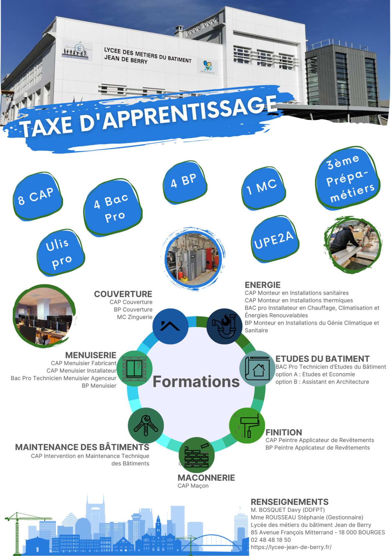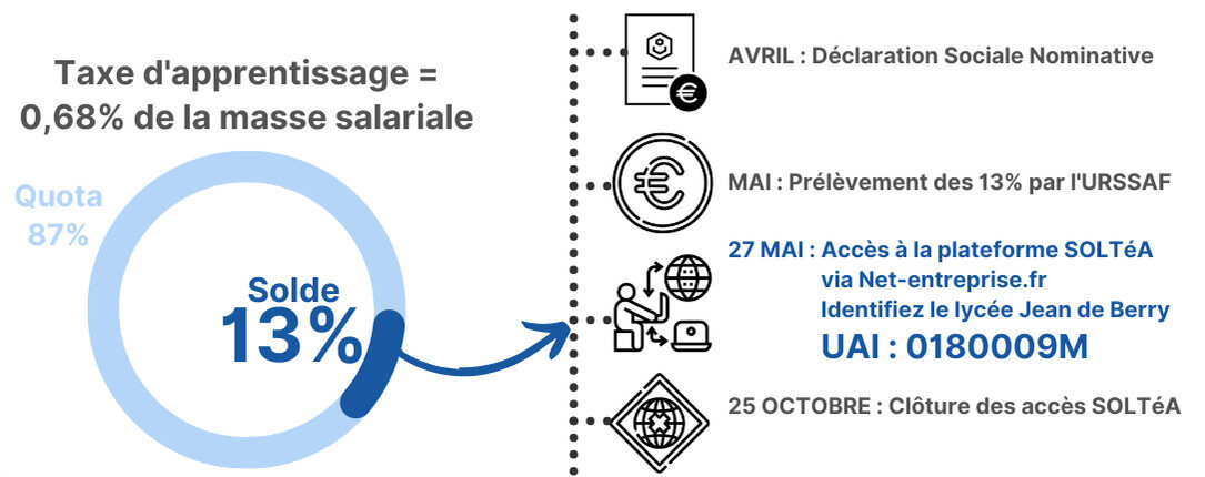 Le nouveau barème, appelé solde de taxe d’apprentissage, correspondant à 13% de la taxe, peut être versé à l’établissement. Pour ce faire, vous devez vous connecter entre le 27 mai et le 25 octobre sur la plateforme SOLTéA via Net-Entreprises.fr et désigner comme bénéficiaire le Lycée Jean de Berry avec le code 0180009M